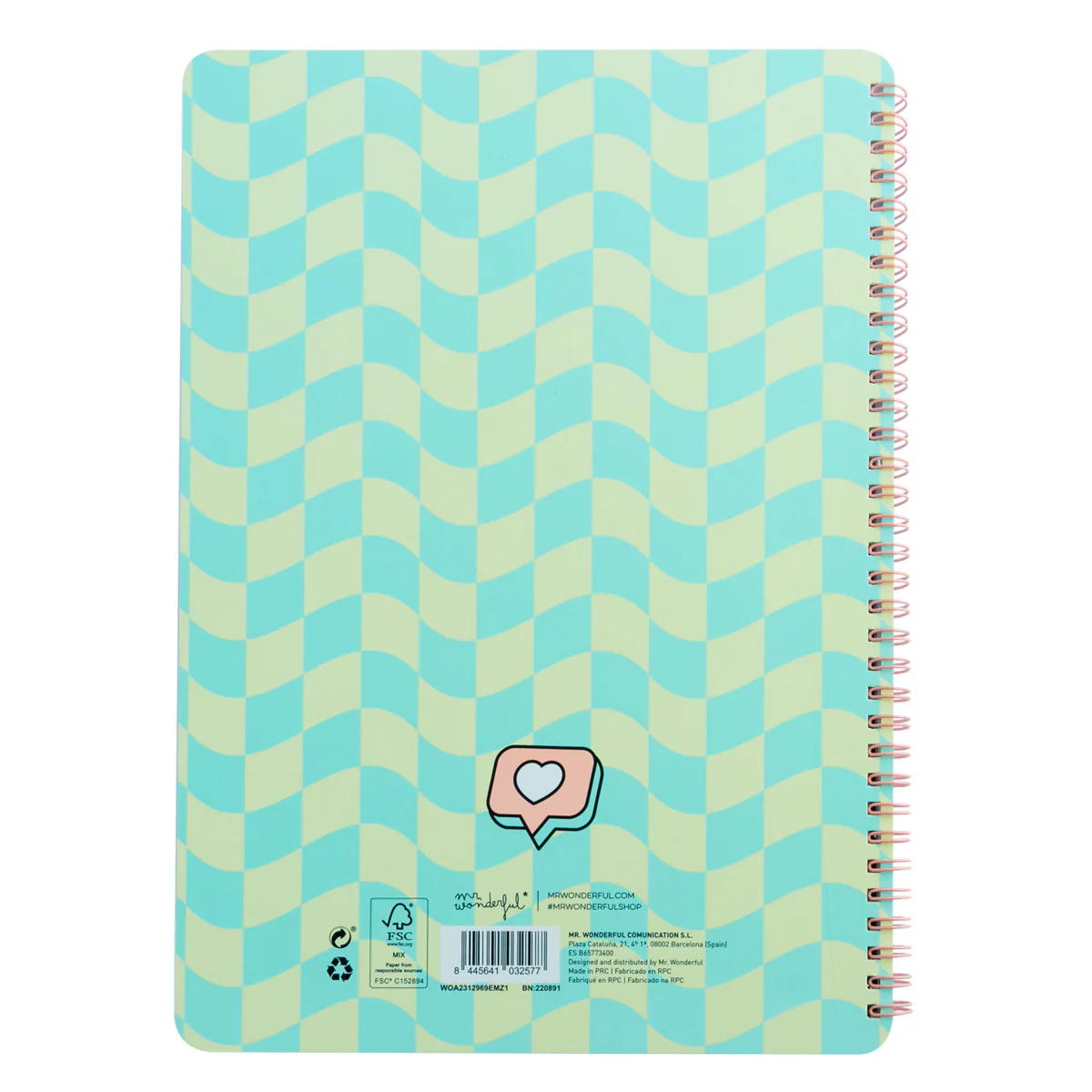 Libreta en?tamaño A4 con?encuadernación en?espiral y?pautado en?cuadrícula. Con tapa dura y?160 páginas de?papel de?80gr. con la certificación FSC, que garantiza que proviene de bosques gestionados de forma responsable. Incluye una?hoja de?pegatinas.