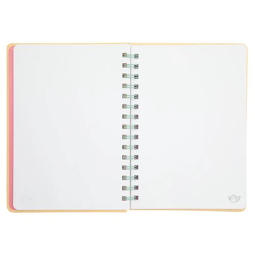 Libreta de tamaño A5 con encuadernación en espiral y un arcoíris en relieve en la portada. En su interior encontramos 160 páginas blancas. Incluye 1 hoja de pegatinas. Cuenta con la certificación FSC, que garantiza que ha sido fabricada con papel proveniente de bosques gestionados de forma responsable.