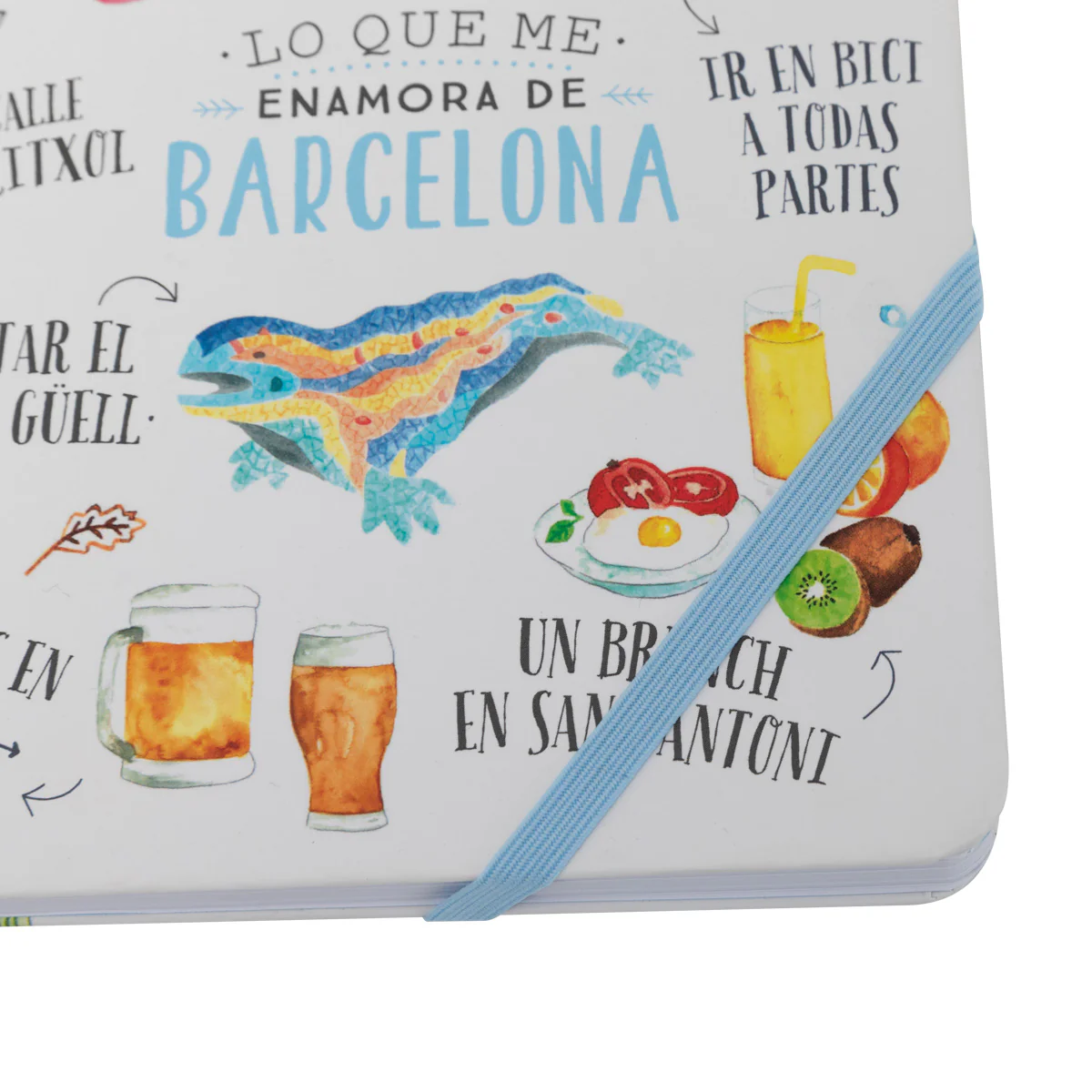 Libreta A5 de cubiertas duras y acabado soft touch. En su diseño se muestran algunas de las mayores atracciones turísticas de la ciudad de Barcelona. Incluye goma elástica para el cierre en una de sus esquinas. Con encuadernación cosida que permite una apertura de 180º, lo que la hace