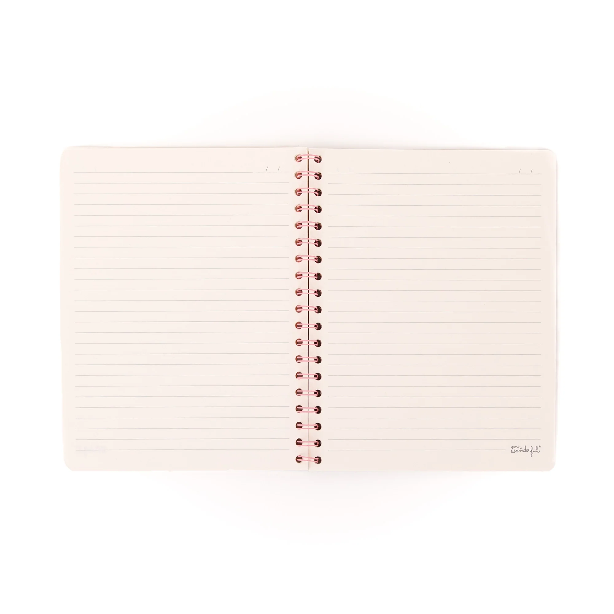 Libreta de tamaño A5 con encuadernación en espiral y tapa dura. Con 160 páginas pautadas de 90gsm, con certificación FSC, que garantiza que el papel proviene de bosques gestionados de forma responsable.