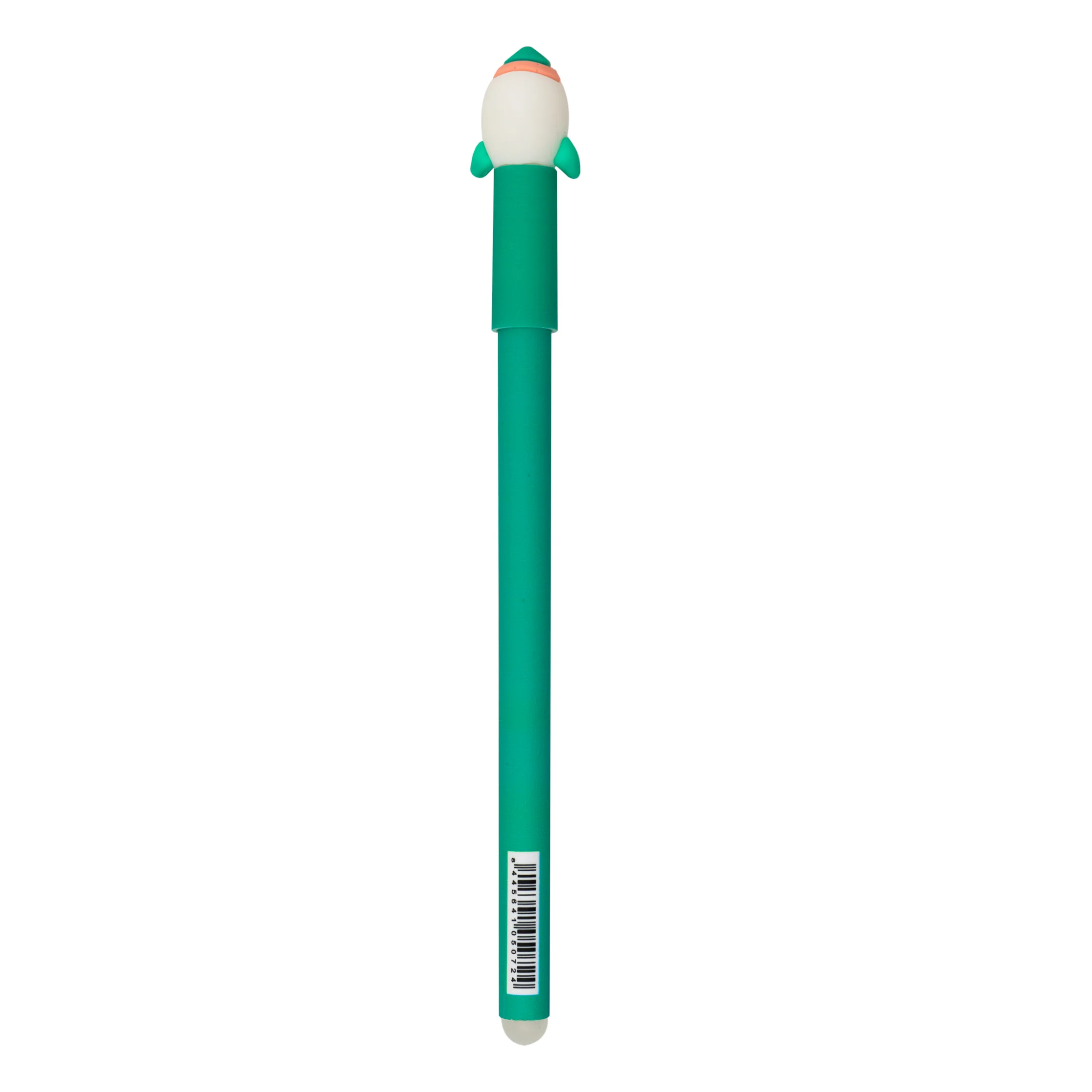 Boli con tinta borrable de color azul y el cohete Arlete en uno de sus extremos.