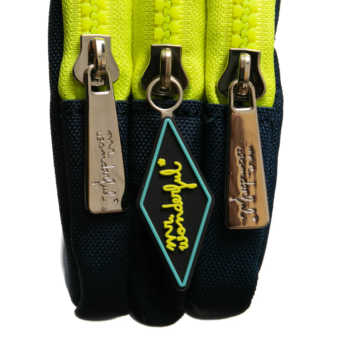 Estuche con tres compartimentos individuales y cierre de cremallera. Realizado en rPET, un material 100 % reciclable obtenido a partir del reciclaje de botellas de plástico.