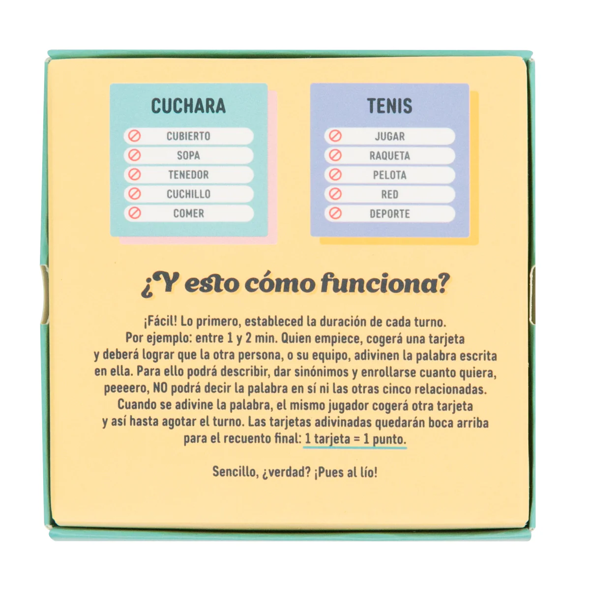 Juego de cartas perfecto para jugar con amigos o en familia. Consta de 100 tarjetas y en cada una de ellas encontramos una palabra que hay que adivinar y cinco relacionadas con el tema. Estas cinco palabras son las que no se pueden utilizar en la descripción, lo que dificulta la tarea y lo hace más divertido.