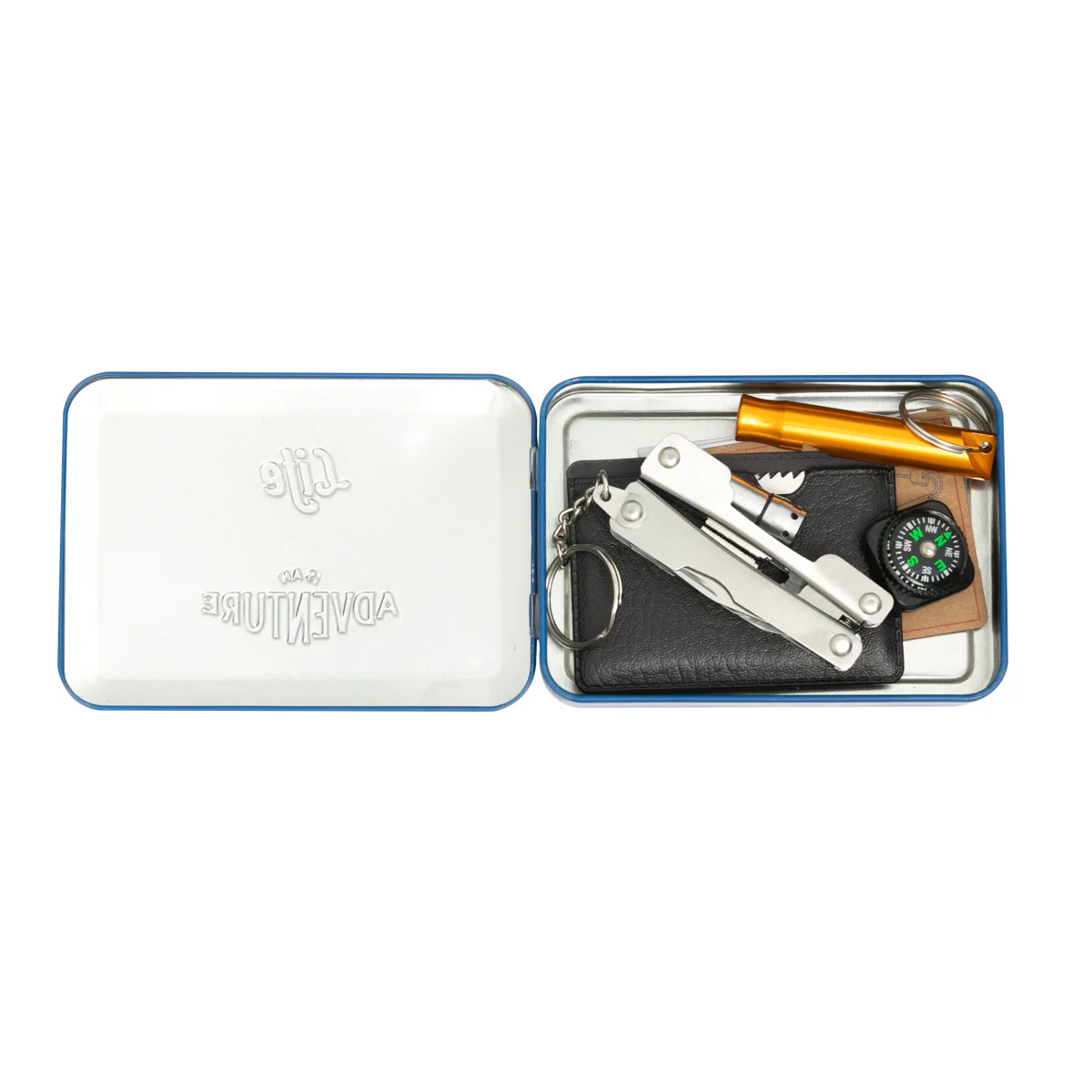 Kit de supervivencia que contiene: 1 brújula, 1 linterna, 1 silbato, 1 encendedor, 1 sierra ultraligera y 1 tarjeta de herramientas. Se presenta en una caja metálica.
