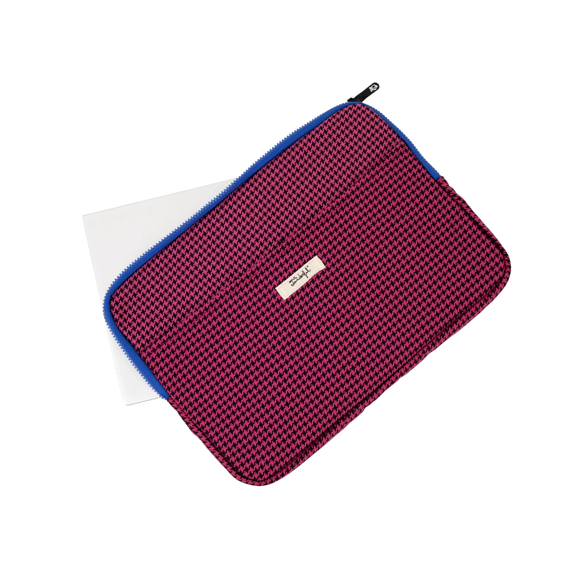 Funda para portátil de 13-14", acolchada y con estampado de pata de gallo. Con cierre de cremallera, la cual, al igual que su tirador, es de con un tono vibrante que es tendencia en estos momentos y que destaca frente al estampado general de la funda.