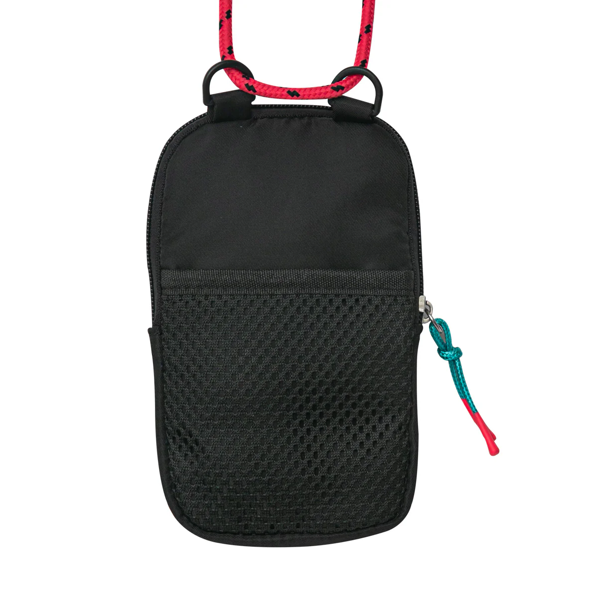 Pequeño bolsito realizado en poliéster, con el tamaño ideal para llevar el teléfono móvil, las llaves y alguna tarjeta. Con una llamativa y divertida cuerda ajustable en tonos flúor, rematada con unos acabados de cera muy originales.