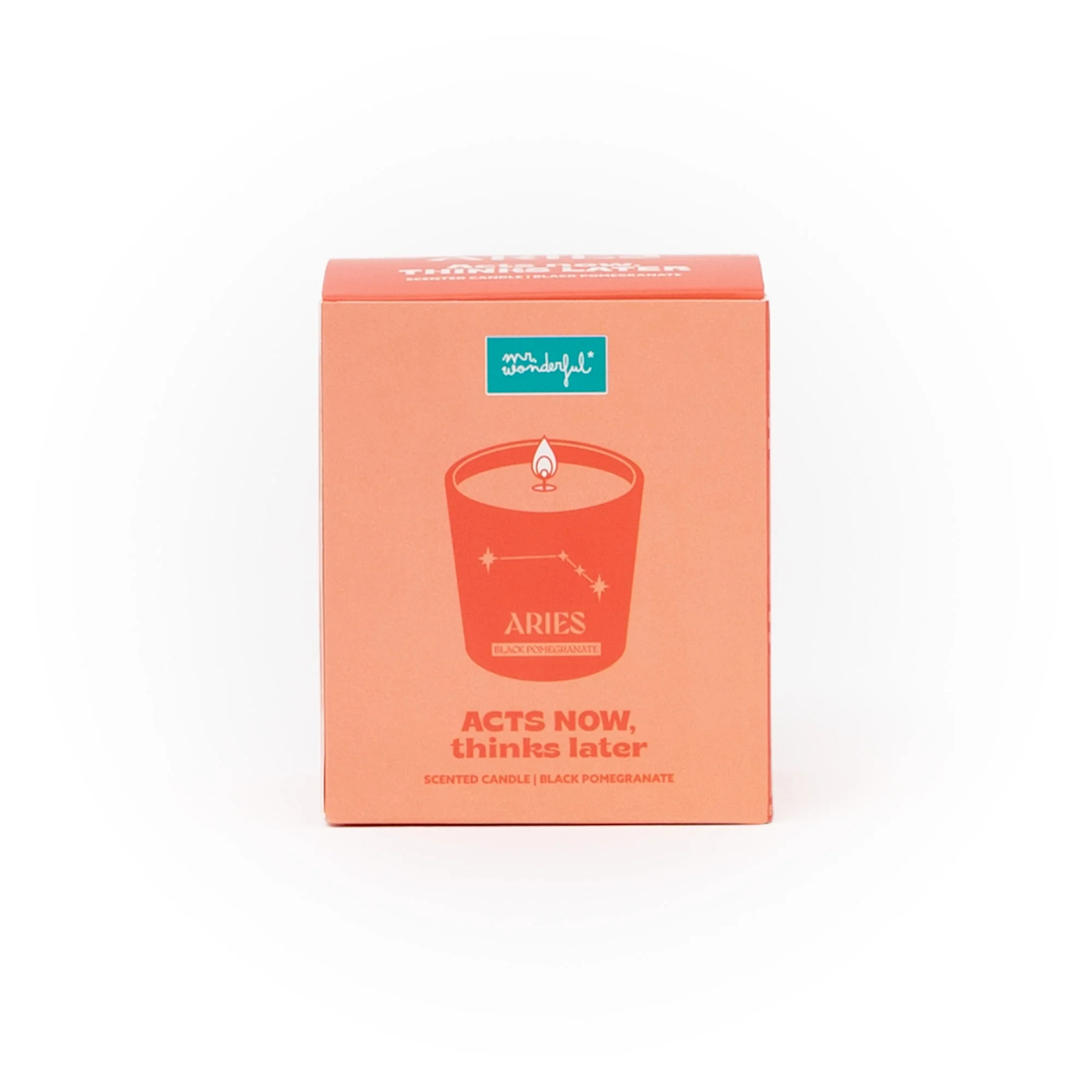 Vela perfumada con aroma a Black pomegranate. Se presenta en un envase de vidrio en el que se ilustra el nombre en inglés y la constelación del signo zodiacal de Aries.