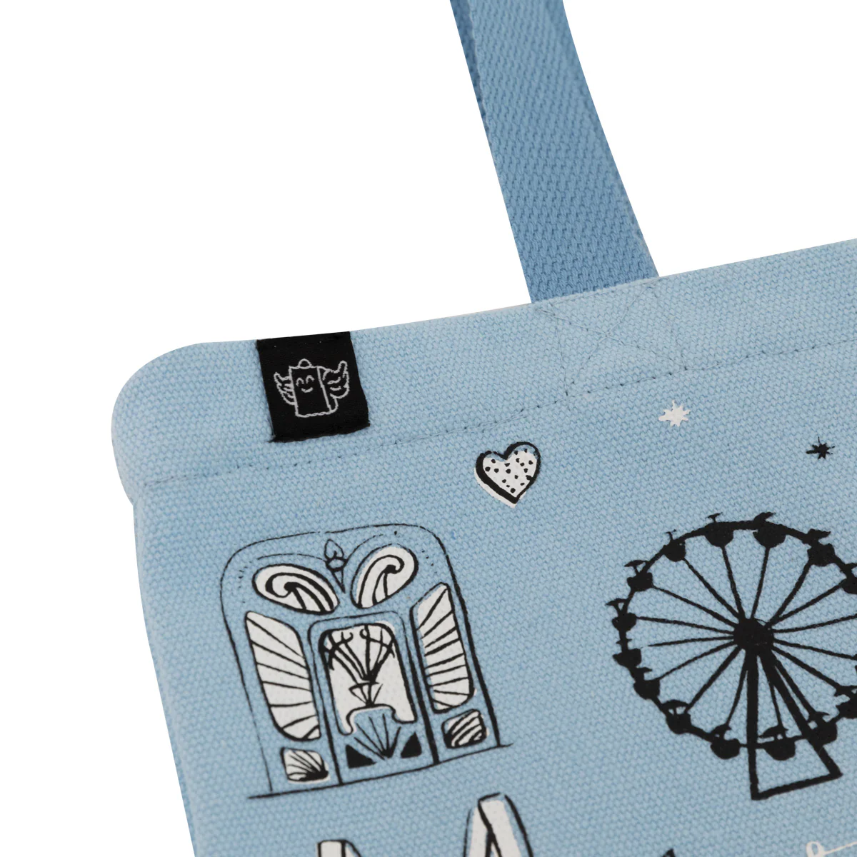 Bolso de tela, estilo tote bag, realizado en algodón, con cierre de cremallera y un bolsillo interior. Su diseño está inspirado en la ciudad de Barcelona.